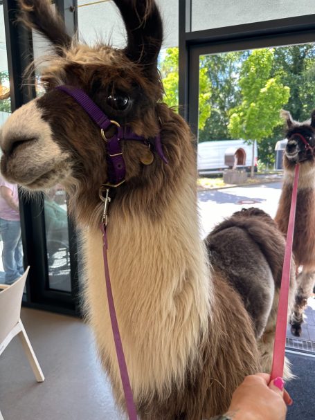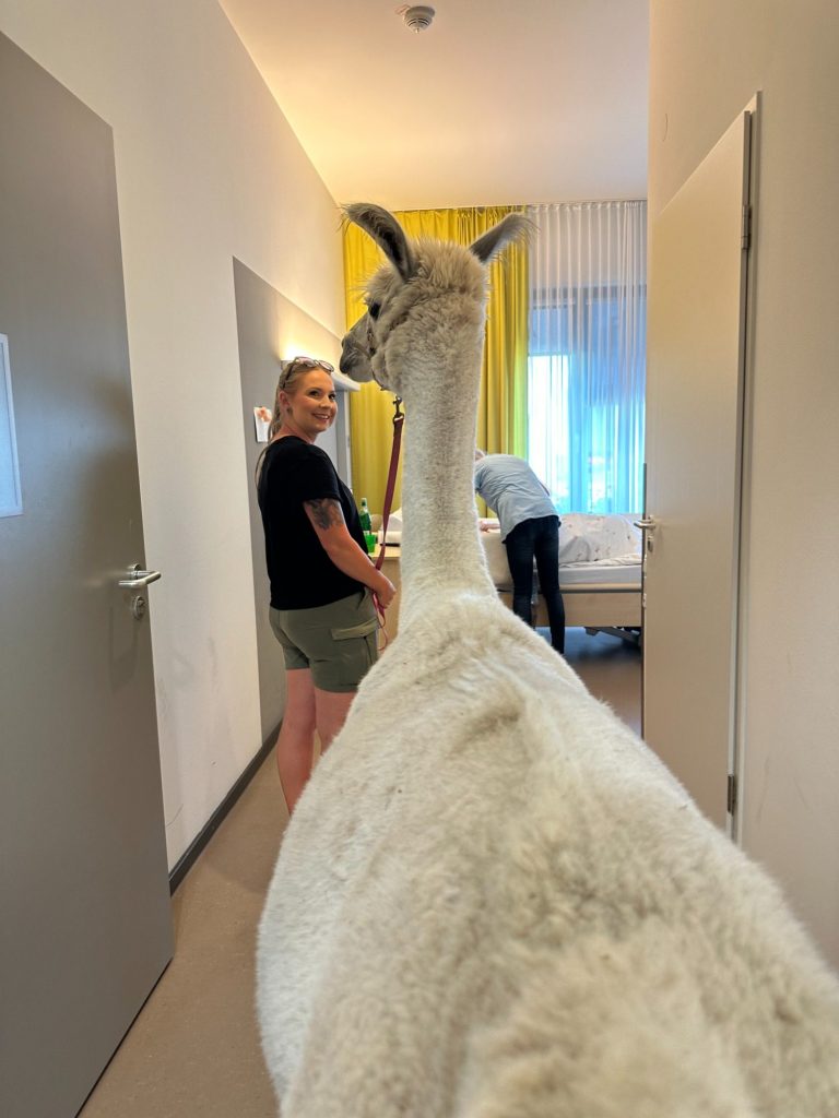 Unser Lama Samson konnte es irgendwann nicht mehr abwarten, auch in das Gebäude hineinzuspazieren. Dietmar, unser 1jähriger Lamaazubi begleitete ihn neugierig. Wir gingen zunächst einen langen Flur entlang und stiegen dort in den Aufzug ein, der uns in die obere Etage brachte. Dort besuchten wir einige weniger mobile Bewohner direkt in ihren Zimmern.