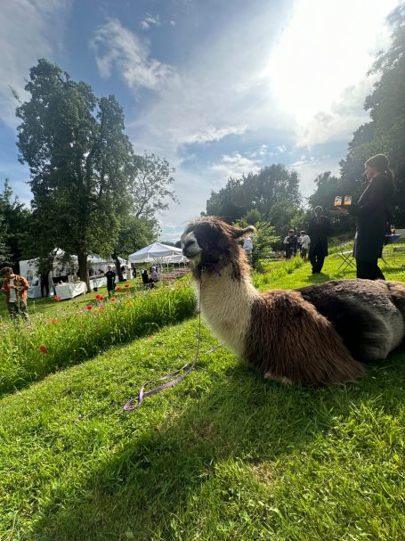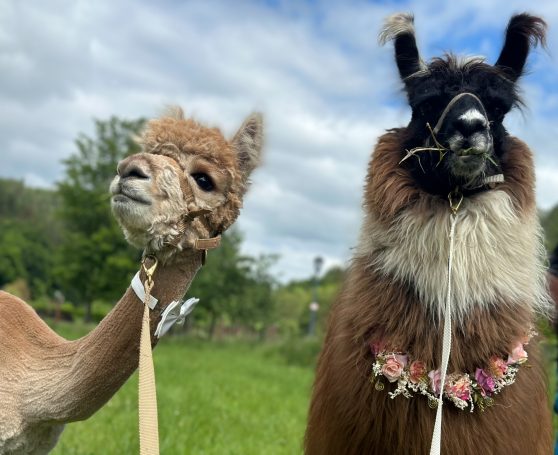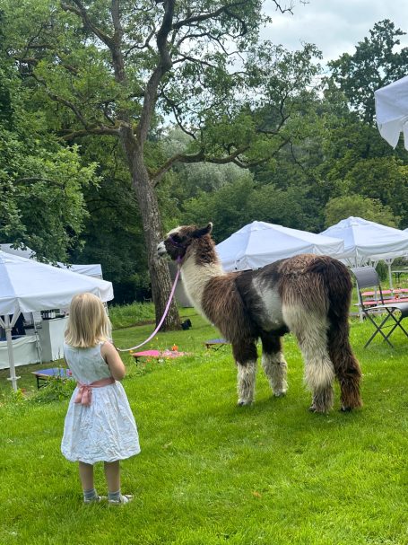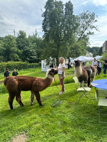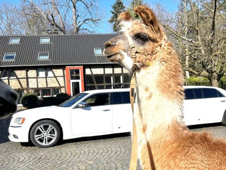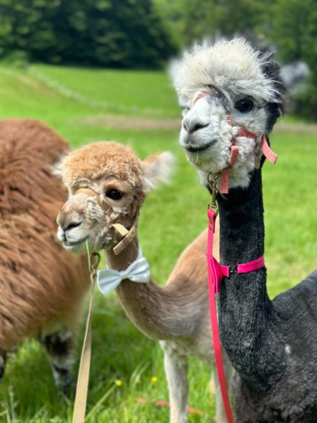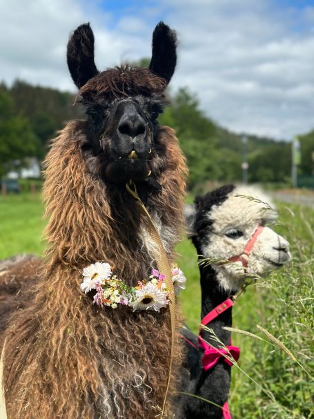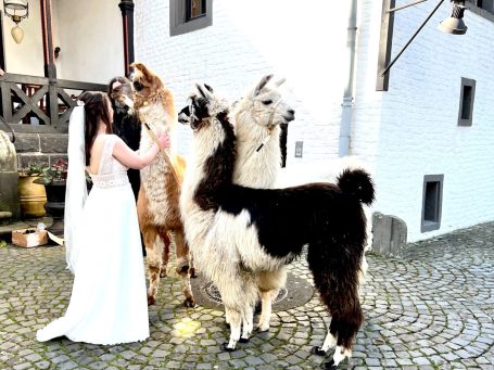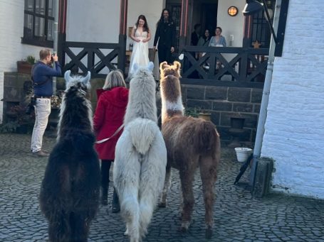 Wir haben einige Lamas und Alpakas, die besonders entspannt und zugänglich sind und an Veranstaltungen wie Hochzeiten, Firmenevents, Geburtstage oder Jubiläen teilnehmen. Wichtig dabei ist, dass unser Team dabei ist und dafür sorgt, dass für die Tiere kein Stress entsteht.